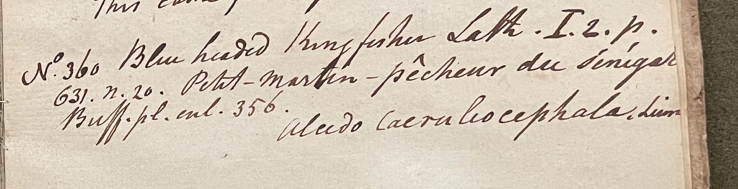 Charles Willson Peale (1741-1827) wrote, in his 19th Lecture (ca. 1799): "No. 360. Blue headed Kingfisher. Lath I. 2. p. 631. N. 20. Petit-Martin-pêcheur du Senégal. Buff. pl. enl. 356. Alcedo caeruleacephala Linn." (Academy of Natural Sciences of Drexel University Archives, coll. 40)
