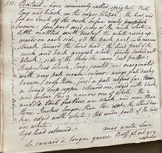 In his 22nd Lecture, Peale wrote: "511. Pintail. here commonly called, sprig-tail. Bill long and black, on the edges bluish; the head, and for an Inch of the neck before rusty purplish brown; forepart and sides of the neck white, a little mottled with dusky, the white rising upwards on each side, at the back part, in a narrow streak toward the hind heard; the hind part of the neck and back greyish white, finely barred with black; side of the body the same but paler; scapulars black, long, pointed, and marginated with very pale cream-colour; wings pale dusky brown; cross them, first a pale rufous bar, then, a broad deep copper-coloured one, edged with black; and below this a narrow one of white; the 2 middle tail feathers are black, and more than three Inches longer than the rest, the others dusky, edged with white; the under parts of the body are white; legs lead coloured. This male is furnished with a small labyrinth. Anas acuta Linn. Le Canard à longue queue Buff. pl. enl. 959." (Academy of Natural Sciences of Drexel University Archives, coll. 40)