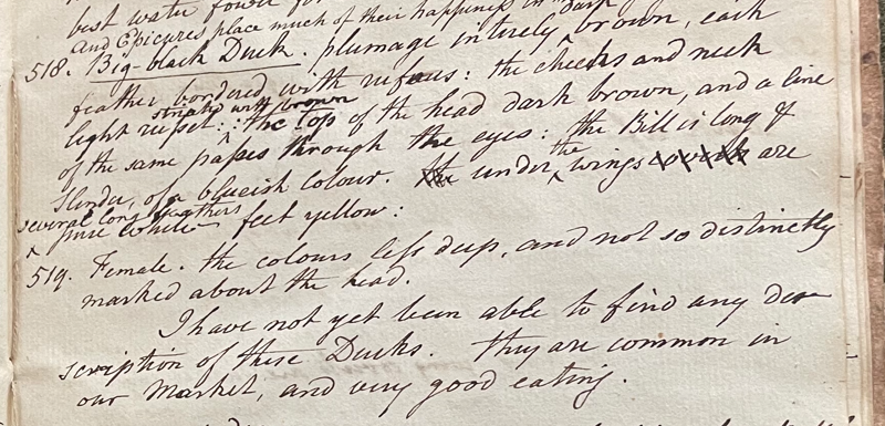 Charles Willson Peale (1741-1827) wrote, in his 22nd Lecture (ca. 1799): "518. Big-black Duck. plumage intirely brown, each feather bordered with rufous; the cheeks and neck light russet, striped with brown; the top of the heard dark brown, and a line of the same passes through the eyes; the Bill is long & slender, of a blueish colour. under the wings are several long feathers […] white; feet yellow. 517. Female. the colours less deep, and not so distinctly marked about the head. I have not yet been able to find any description of these Ducks. they are common in our Market, and very good eating." (Academy of Natural Sciences of Drexel University Archives, coll. 40)