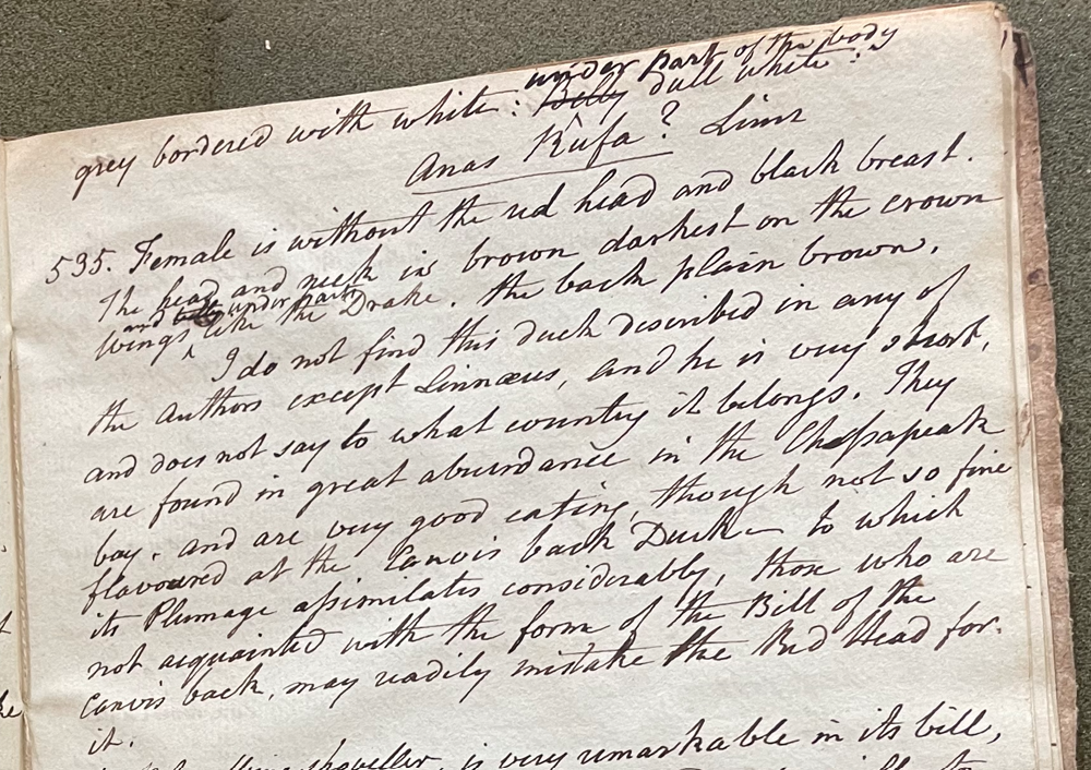 An undated scrap of paper tucked into Peale's 21st lecture manuscript contains a scribbled list of duck specimens, including: "Red Head D. (A. rufa)" (ANSP Archives, coll. 40).