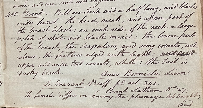 Charles Willson Peale (1741-1827) wrote, in his 21st Lecture (ca. 1799): "485. Brent. Bill one Inch and a half long, and black; irides hazel; the head, neck, and upper part of the breast, black; on each side of the neck a large patch of white and black mixed; the lower part of the breast, the scapulars, and wing coverts, ash colour, the feathers edged with light; upper and under tail coverts, white; the tail is dusky black. Anas bernicla Linn. Le Cravant. Buff. pl. enl. 342. Brent Latham No. 27. The female differs on having the plumage less bright, and in young birds the white on the sides of the neck is small, or wholy deficient." (Academy of Natural Sciences of Drexel University Archives, coll. 40)