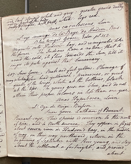 Peale wrote, in "A Walk Through the [Philadelphia] Museum" (1805–1806): "Here is the Snow Goose (A. hyperborea) which the Indians say that to avoid the cold it flies towards the Sun & singes its pate against that luminary. said to be common to Assia as well as America. some curious accounts are given of the manner of catching them in Siberia. Blue Winged Goose (A. caerulescens) belongs only to America" (Historical Society of Pennsylvania, coll. 0481).