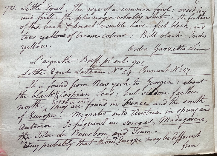 Charles Willson Peale (1741-1827) wrote, in his 25th Lecture (ca. 1799): "731. Little Egret. The size of a common fowl; crest long and full; the plumage wholly white; the feathers of the back & breast resemble hair; feet black; and toes yellow of cream colour; bill black; irides yellow. Ardea Garzetta Linn. L'aigrette Buff. pl. enl. 901. Little Egret Latham No. 59. Pennant No. 347. It is found from New York to Georgia; about the black & Caspian Seas; but seldon farther north. It is said they are found in France and the south of Europe. Migrates into Austria in spring and Autumn. Is frequent in Senegal, Madagascar, Isle de Bourbon, and Siam." (Academy of Natural Sciences of Drexel University Archives, coll. 40)