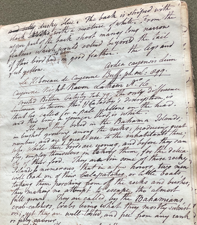 Peale wrote, in "A Walk Through the Philad[elphi]a Museum" (1805–1806): "Catesby described a bird of Carolina under the name Crested Bittern (A. Cayensis) but other authors call it Night Raven.—It has a proportioned Bill to our Night Raven (A. Nycticorax). Most authors have given these Birds the names of night Raven, on account of a strange sort of Croaking which they make during the Night. They fly in the night, and lodge in day light in trees near the water" (Historical Society of Pennsylvania, coll. 0481).