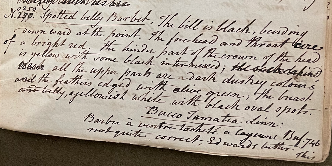 Peale wrote, in "A Walk Through the Philad[elphi]a Museum" (1805–1806): "… according to Latham & Buffon, it is a stupid, clumsy, ill made, or ill formed bird. Strange language for naturalists! Its food is large Beetles. The general shape of the bird as its strength of Bill, fits it well for such prey, and no doubt it needed not much cunning to subsist in the thick woods of hot Climates where inumerable insects breed. The spotted Belly Barbet (B. Tamatia) of Cayanne & Brazil." (Historical Society of Pennsylvania, coll. 0481)