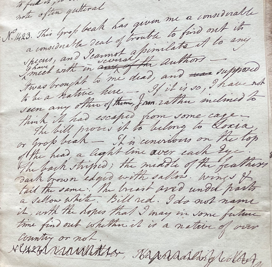 Charles Willson Peale (1741-1827) wrote, in his 32nd Lecture (ca. 1799): "No. 1423. This Gross Beak has given me a considerable deal of trouble to find out its species, and I cannot assimilate it to any I have meet with in several authors. It was brought to me dead, and supposed to be a native here. If it is so, I have not seen any other of them. I am rather inclined to think it had escaped from some cage. The bill proves to belong to Loxia, a Gross Beak. It is cinerious on the top of the head, a light line over each Eye; the back striped; the middle of the feathers dark brown edged with sallow; wings & tail the same; the breast and under parts a sallow white; bill red. I do not name it, with the hopes that I may in some future time find out whether it is a native of our country or not." (Academy of Natural Sciences of Drexel University Archives, coll. 40)
