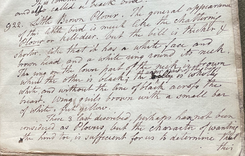 Charles Willson Peale (1741-1827) wrote, in his 26th Lecture (ca. 1799): "922. Little Brown Plover. The general appearance of this little bird is much like the Chattering Plover or Kill-deer, but the bill is thicker & shorter. Like that [species] it has a white face and brown head, and a white ring round its neck. The ring on the lower part of the neck is brown where the other is black; the under parts of the body is wholly white, and without the line of black across the breast; wing quils brown with a small bar of white; feet yellow." (Academy of Natural Sciences of Drexel University Archives, coll. 40)
