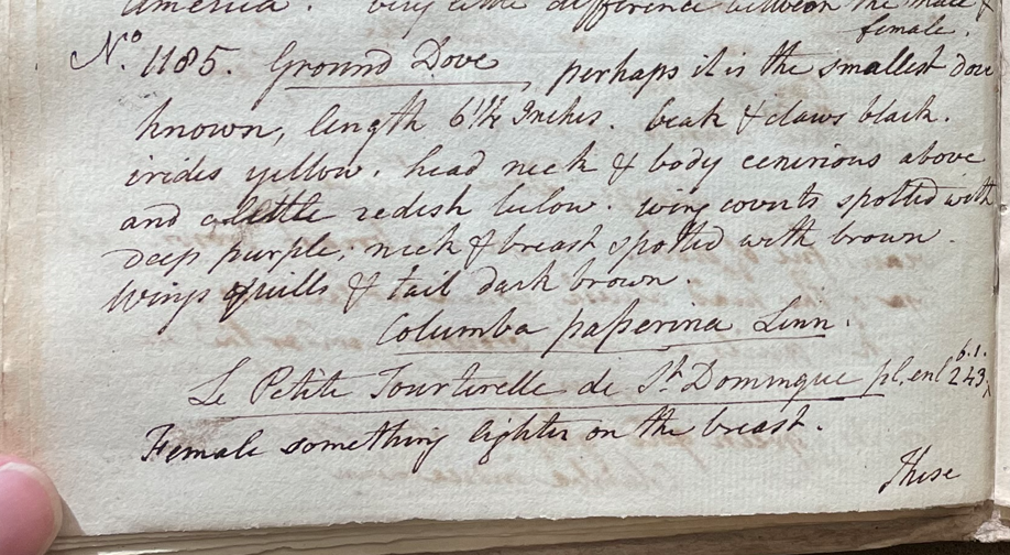 Peale wrote, in "A Walk Through the Philad[elphi]a Museum" (1805–1806): "Perhaps the smallest of this genus is the Ground Dove (C. passerina) they inhabit the warmer parts of America & the Islands contiguous thereto; chiefly between the tropic, though sometimes found in Carolina." (Historical Society of Pennsylvania, coll. 0481)