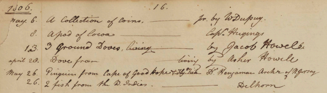Peale Museum Accessions Book, 28 April 1806. Historical Society of Pennsylvania, coll. 0481, p. 16.