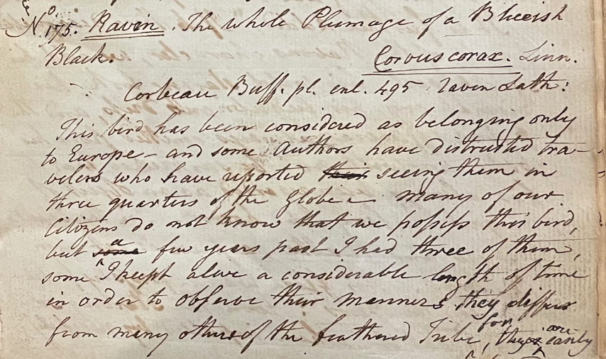 Charles Willson Peale (1741-1827) wrote, in his 17th Lecture (ca. 1799): "No. 175. Raven. The whole plumage of a Blueish Black. Corvus corax. Linn. Corbeau. Buff. pl. enl. 495. Raven Lath. This bird has been considered as belonging only to Europe, and some authors have distrusted travelers who have reported seeing them in three quarters of the globe. Many of our citizens do not know that we possess this bird, but a few years past I had three of them. Some I keept alive a considerable length of time in order to observe their manners. They differ from many others of the feathered Tribe. They are easily tamed even when old, are remarkably familiar in the domesticated state, and will eat any thing that is given them; yet prefer flesh. It is singular that this Bird should have so bad a character given of it, yet with very little foundation." (Academy of Natural Sciences of Drexel University Archives, coll. 40)