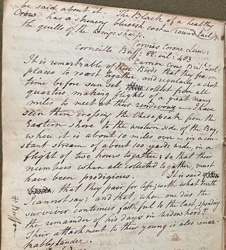 A mounted male specimen of "Corvus corone (Carrion Crow)" from Europe was listed (APS Library, Mss.B.P31).