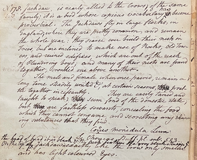 Charles Willson Peale (1741-1827) wrote, in his 17th Lecture (ca. 1799): "No. 178. Jackdaw, is nearly allied to the Crows, of the same family. It is a bird whose copious vocabulary has become proverbial. The Jackdaws fly in large flocks, in England, where they are pretty common, and remain the whole year; they scarce ever build their nests in trees, but are inclined to make use of Rocks, old towers, and ruined edifices, which are out of the reach of plundering boys; and many of their nests are found togather, crowded one above another." (Academy of Natural Sciences of Drexel University Archives, coll. 40)