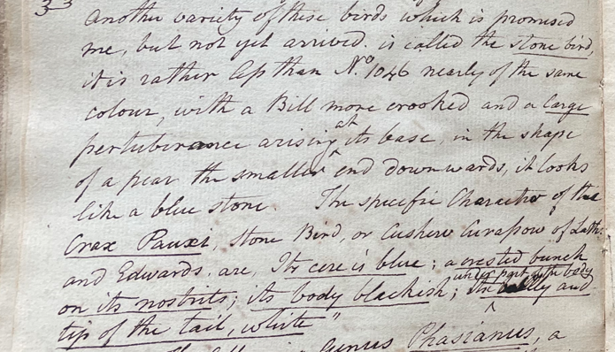 Charles Willson Peale (1741-1827) wrote, in his 28th Lecture (ca. 1799): "Another variety of these birds which is promised me, but not yet arrived, is called the Stone bird; it is rather less than No. 1046 [=Black Curassow, Crax alector], nearly of the same colour, with a Bill more crooked and a large pertuberance arising at its base, in the shape of a pear, the smaller end downwards; it looks like a blue stone. The specific character of the Crax pauxi, Stone bird, or Cushew Curassow of Latham and Edwards, are: Its cere is blue; a crested bunch on its nostrils; its blody blackish; under part of the body and tip of the tail, white." (Academy of Natural Sciences of Drexel University Archives, coll. 40)
