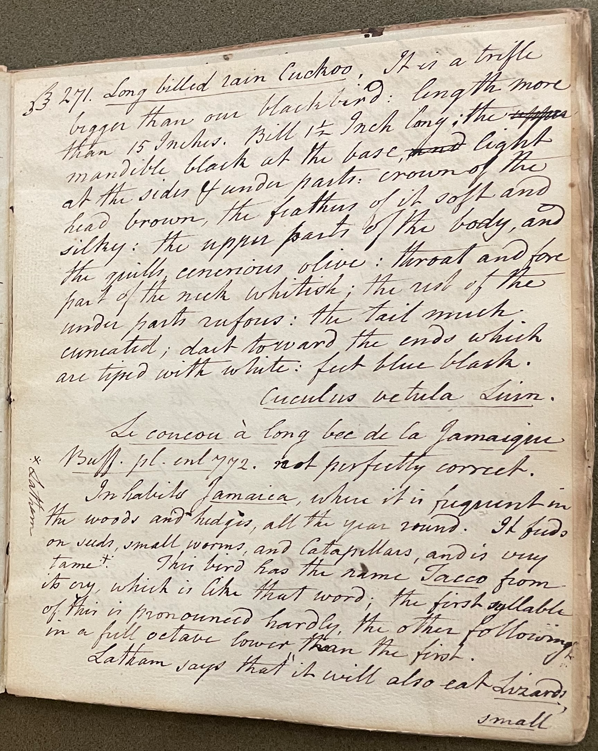 Charles Willson Peale (1741-1827) wrote, in his 18th Lecture (ca. 1799): "271. Long billed rain Cuckoo. It is a trifle beigger than our blackbird; length more than 15 Inches; Bill 1 ½ Inch long; the upper mandible black at the base, light at the sides & under parts; crown of the head brown, the feathers of it soft and silky; the upper parts of the body, and the quills cenerious olive; throat and forepart of the nek whitish; the rest of the under parts rufous; the tail much cuneated; dark toward the ends which are tipped with white; feel blue black. Cuculus vetula Linn. Le coucou à long bec de la Jamaique Buff. pl. enl. 772. not perfectly correct. Inhabits Jamaica, where it is frequent in the woods and hedges, all the year round. It feeds on seeds, small worms, and Catapillars, and is very tame." [A note in the margin indicates this information was sourced from Latham.] (Academy of Natural Sciences of Drexel University Archives, coll. 40)