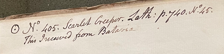 Charles Willson Peale (1741-1827) wrote, in his 20th Lecture (ca. 1799): "No. 405. Scarlet Creeper. Lath. p. 7…[page cuts off]….I received this from Batavia." (Academy of Natural Sciences of Drexel University Archives, coll. 40)