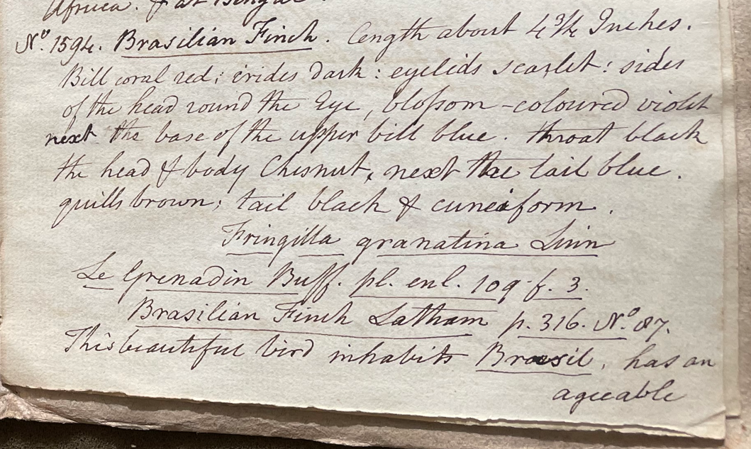 Peale wrote, in "A Walk Through the Philad[elphi]a Museum" (1805–1806): "we will leave this case to notice one still more beautiful in the Brazilian Finch (F. granatina)" (Historical Society of Pennsylvania, coll. 0481).