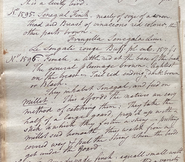 Charles Willson Peale (1741-1827) wrote, in his 34th Lecture (ca. 1799): "No. 1595. Senegal Finch. Nearly the size of a wren. Head and Breast of vinacious red colour, the other parts brown. Fringilla senegala Linn. Le Sengali rouge Buff. pl. enl. 157. f. 1. No. 1596. Female, a little red at the base of the back. The general plumage brown, lightest on the breast. Tail red ending in dark brown or black. They inhabit Senegal, and feed on Millet. This affords the natives an easy method of catching them. They take the half of a large goard, prep it up with a stick to which they fasten a string, putting millet seed beneath, they watch from a covered way & pull the string when the birds get under the goard." (Academy of Natural Sciences of Drexel University Archives, coll. 40)