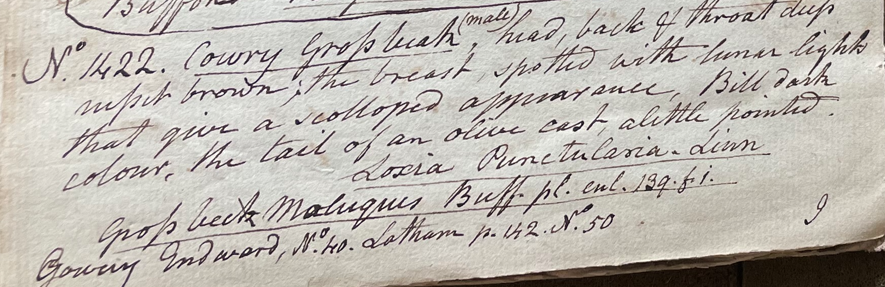 Charles Willson Peale (1741-1827) wrote, in his 32nd Lecture (ca. 1799): "No. 1422. Cowry Gross beak (male) head, back & throat deep russet brown; the breast spotted with lunar-lights that give a scalloped appearance; Bill dark colour; the tail of an olive cast, a little pointed. Loxia punctularia Linn. Gross Bec Maluques. Buff. pl. enl. 139. f. 1. Gowry Edwards, No. 140. Latham p. 142. No. 50." (Academy of Natural Sciences of Drexel University Archives, coll. 40)