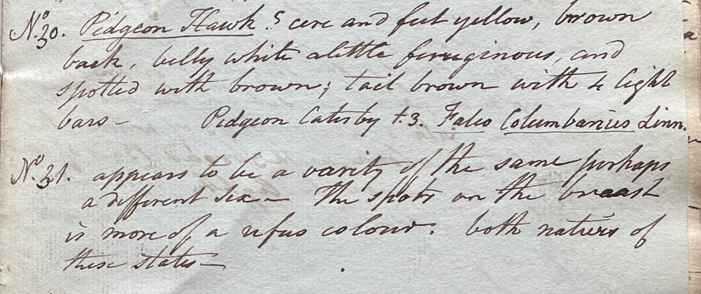 Charles Willson Peale (1741-1827) wrote, in his 13th Lecture (ca. 1799): "No. 30. Pidgeon Hawk, cere and feet yellow; brown back; belly white, a little ferruginous, and spotted with brown; tail, brown with 4 light bars. Pidgeon Catesby t. 3. Falco columbarius Linn. No. 31. Appears to be a variety of the same, perhaps a different sex. The spots on the breast […] a rufus colour. Both [are] natives of these states … No. 33. Merlin Hawk, … from Europe. Lead coloured back, with small lines of black; under parts white finishing on the legs to something of a russet colour; spotted with brown; the throat pure white; tail of the same colour as the back, shaded into black and finishing with white at the tip. Falco AEsalon Linn. l'emerillon Buff. The Merlin, though small, is not inferior in courage to any of the Falcon tribe. It was used for taking larks, partridges and quails, which it frequently killed at one blow, striking them on the breast, head or neck." (Academy of Natural Sciences of Drexel University Archives, coll. 40)