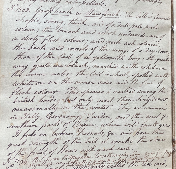 Peale wrote, in "A Walk Through the Philad[elphi]a Museum" (1805–1806): "The Hawfinch (L. Coccothraustes) and the green finch (L. Chloris) are birds of Europe." (Historical Society of Pennsylvania, coll. 0481)