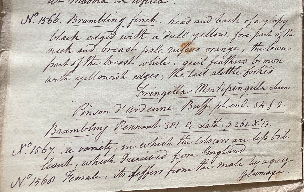 Charles Willson Peale (1741-1827) wrote, in his 34th Lecture (ca. 1799): "No. 1566. Brambling finch. head and back of a glossy black edged with a dull yellow, fore part of the neck and breast pale rufous orange, the lower part of the breast white; quil feathers brown with yellowish edges; the tail a little forked. Fringilla Montifringilla Linn. Pinson d'Ardenne Buff. pl. enl. 54. f. 2. Brambling Pennant 381. E. Lath. p. 261. No. 13. No. 1567. A variety in which the colours are less brilliant, which I received from England." (Academy of Natural Sciences of Drexel University Archives, coll. 40)