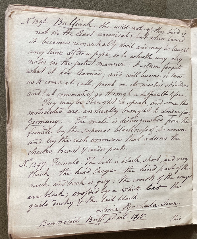 Peale wrote, in "A Walk Through the Philad[elphi]a Museum" (1805–1806): "The European Bullfinch (Pyrrhula) is a species that the female as well as the male may be taught musick, and by a regular education becomes greater adept than perhaps any other bird, and even be taught to speak little prasses [phrases], which it does with such an air of descernment and penetration, appearing as if animated with an inteligent principle." (Historical Society of Pennsylvania, coll. 0481)