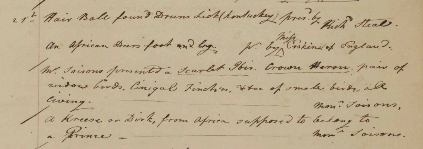 On 21 May 1805, a "Crown Heron, living" donated by Bellvue Soisson was entered in the Peale Museum Accessions Book (Historical Society of Pennsylvania, coll. 0481).