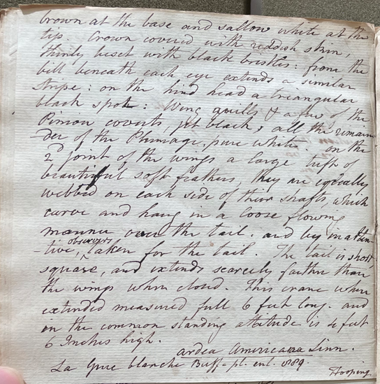 Peale continued: "This was in the month of July [a footnote indicates this information was sourced from "Smith's History of Virginia"], which proves, that in those early days this species bred in the then desert parts of the southern provinces, till driven away by population, as was the case with the Common Crane in England; which abounded in their undrained fens, till cultivation forced them entirely to quit that Kingdom. In the French Encyclopedia, it is said that many are killed and carryed to market at Louisana, and so esteemed as to obtain a ready sale, that the hunters are in the habit of cutting off the legs as soon as they kill them, to render them less […] to carry, which is the cause, […] to large size of the bird that they seldom find the skin in France." (ANSP Archives, coll. 40)