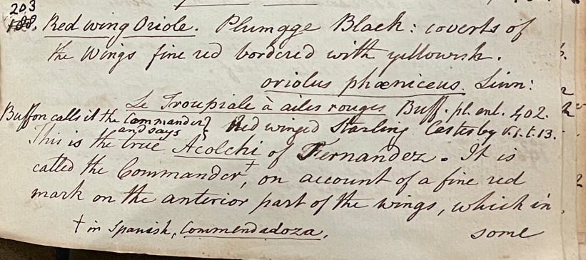 Peale wrote, in his 17th Lecture (ca. 1799): "No. 188. 203. Red wing Oriole. Plumage Black; coverts of the wings fine red bordered with yellowish. Oriolus phoeniceus Linn. Le Troupiale à ailes rouges. Buff. pl. enl. 402. Red winged Starling Catesby v. 1. t. 13." (Academy of Natural Sciences of Drexel University Archives, coll. 40)