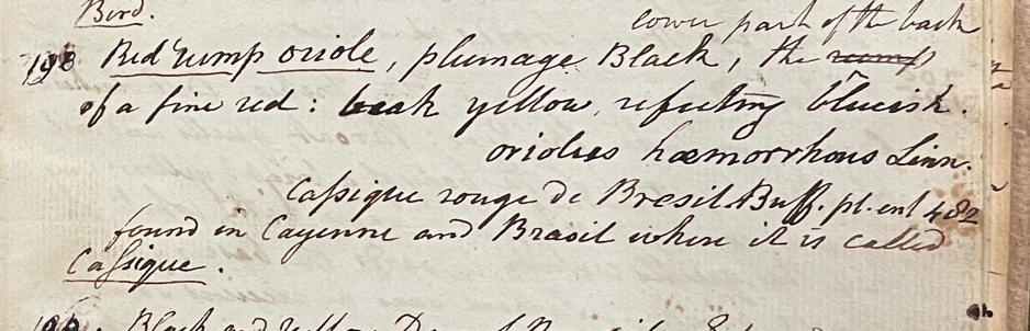 Peale wrote, in "A Walk Through the Philad[elphi]a Museum" (1805–1806): "The Red Rump Oriole (oriolus hæmorrhous) is found in Cayanne & brazil, where it is called Cassique." (Historical Society of Pennsylvania, coll. 0481)