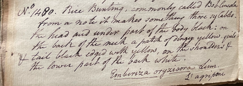 Charles Willson Peale (1741-1827) wrote, in his 33rd Lecture (ca. 1799): "No. 1480. Rice Bunting, commonly called Bob-lincoln, from a note it makes something [like] those syllables. the head and under part of the body black; on the back of the neck a patch of dingy yellow; quils & tail black edged with yellow; on the shoulders & the lower part of the back white. Emberiza oryzivora Linn. L'agripene, ou l'ortolan de Riz Buff. No. 1481. Female, the general Plumage is a yellowish brown striped with black. Called Reed birds. These birds inhabit in vast numbers the Island of Cuba, where they commit great ravages among the early crops of rice, which precede those of Carolina. from Cuba, they pass over the sea in numerous flights, directly north and [are] very often heard by sailors on their passage." (Academy of Natural Sciences of Drexel University Archives, coll. 40)