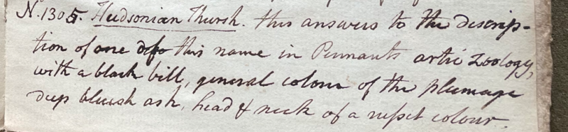 Charles Willson Peale (1741-1827) wrote, in his 31st Lecture (ca. 1799): "No. 1305. Hudsonian Thursh [sic]. this answers to the description of one [under] this name in Pennant's Arctic Zoology, with a black bill, general colour of the plumage deep bluish ash, head & neck of a russet colour, a line over the Eyes & the throat enclining to yellow. WhetherThis is a particular change of Plumage of our common black-bird in the fall, and probably No. 1306 is the same bird…its dress in the spring. No. 1307. I shall for the present call the brown Thrush, it is the only specimen I have meet with, but I have not unfrequently heard of white birds being seen amongst our black birds. In the collection belonging to the Mr. Carlson at Upsal in Sweden, is a bird very much like this except that it appears to have setaceous feathers at the base of its bill, which would character would places it with the Corvus, Crows, but in the specimen before us, there is no feathers of that kind" (Academy of Natural Sciences of Drexel University Archives, coll. 40).