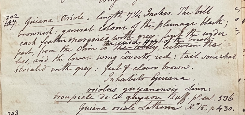 Charles Willson Peale (1741-1827) wrote, in his 17th Lecture (ca. 1799): "No. 199. Guiana Oriole. Length 7 ¼ Inches. The bill brownish; general colour of the plumage black; each feather margined with grey, but the under part, from the chin to the under part of the breast, to the legs, and the lower wing coverts, red; tail somewhat striated with grey; feet & claws brown. Inhabits Guiana. Oriolus guyanensis Linn. Troupiale de la guyane. Buff. pl enl. 536. Guiana oriole. Latham No. 15. p. 430." (Academy of Natural Sciences of Drexel University Archives, coll. 40)