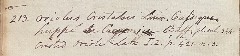 Charles Willson Peale (1741-1827) wrote, in his 17th Lecture (ca. 1799): "213. Oriolus cristatus Linn. Cassique huppé de Cayenne. Buff. pl. enl. 344. Crested Oriole. Lath. I. 2. p. 421. n. 3." (Academy of Natural Sciences of Drexel University Archives, coll. 40)