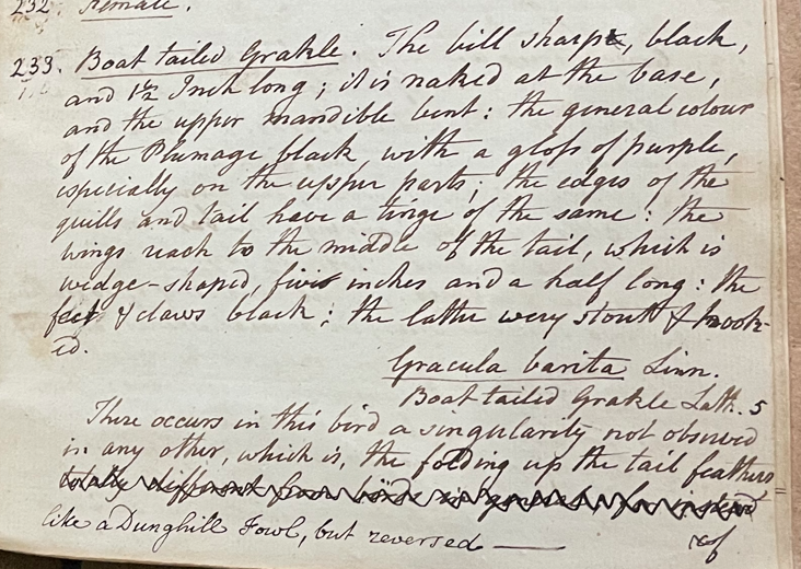 Charles Willson Peale (1741-1827) wrote, in his 17th Lecture (ca. 1799): "No. 233. Boat tailed Grakle. The bill sharp, black, and 1 ½ Inch long; it is naked at the base, and the upper mandible bent; the general colour of the plumage black, with a gloss of purple, especially on the upper parts; the edges of the quills and tail have a tinge of the same; the wings reach to the middle of the tail, which is wedge-shaped, five inches and a half long; the feet & claws black; the latter very stout & hooked. Gracula barita Linn. Boat tailed Grakle Lath." (Academy of Natural Sciences of Drexel University Archives, coll. 40)
