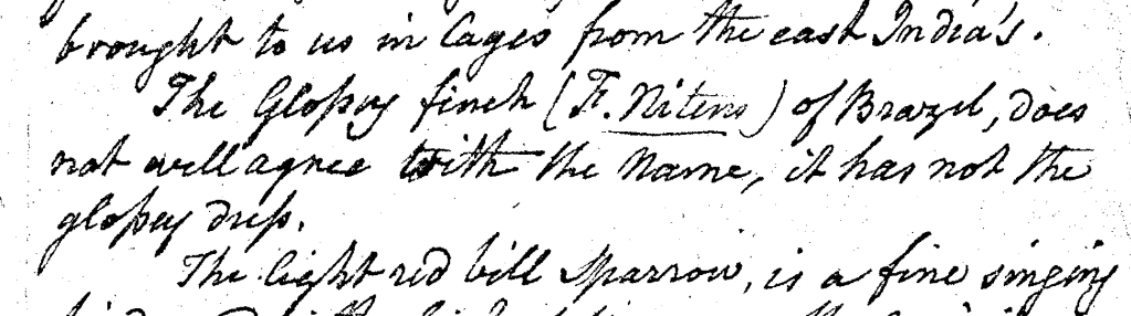 Charles Willson Peale (1741-1827) wrote, in "A Walk Through the Philad[elphi]a Museum" (1805–1806): "The Glossy finch (F. Nitens) of Brazil, does not well agree with the Name, it has not the glossy dress." (Historical Society of Pennsylvania, coll. 0481)