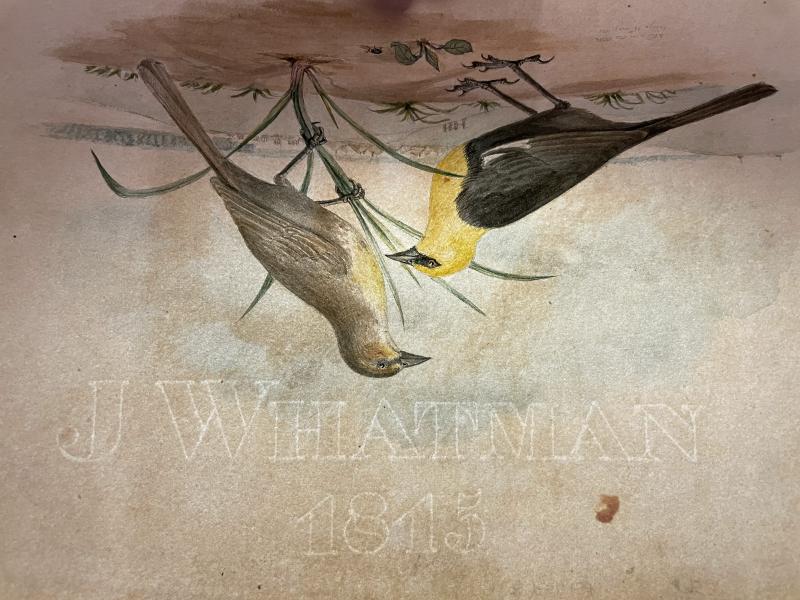 Titian Ramsay Peale (1799-1885) deposited a collection of "Sundry small Birds, [and] Anatomical preparations" on 23 March 1821, after returning from the Long Expedition, which presumably included male and female specimens (Accessions Book, Historical Society of Pennsylvania, coll. 0481). He also deposited a "finished" drawing of "Oriole. M&F", which probably refers to an extant drawing with pencil annotations that read “Oriolus icterocephalus L.” and “killed near the Ottoes Village 14th May 1820” (American Philosophical Society Library, Mss.B.P31.15d). This colored drawing (shown here from both sides) was executed on high-quality wove paper with a "J Whatman / 1815" watermark.