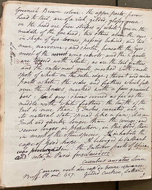 Peale continued: "[This specimen] belonged to [François] Valliant [1753–1824] who procured it in the Interior parts of Africa and sold it in Paris for 3 Luisdors. Cuculus auratus Linn. Coucou verd du cap de bonne Esperance Buff. pl. enl. 657. Gilded Cuckoo, Latham. I find the passage in Valliant's travels [in margin: Vall: "Travels p. 110"]: "The cuckoos in every climate, never lays but in the nests of other birds, which by these means, she loads with the burden of hatching her young; The touraco, (he calls it) more affectionate and more careful of its family, constructs its own nest, where it lays its Eggs and atches them itself." The character, besides, the authorities quoted, justify my giving it Place here, contrary to Valliant's opinion." (ANSP Archives, coll. 40)