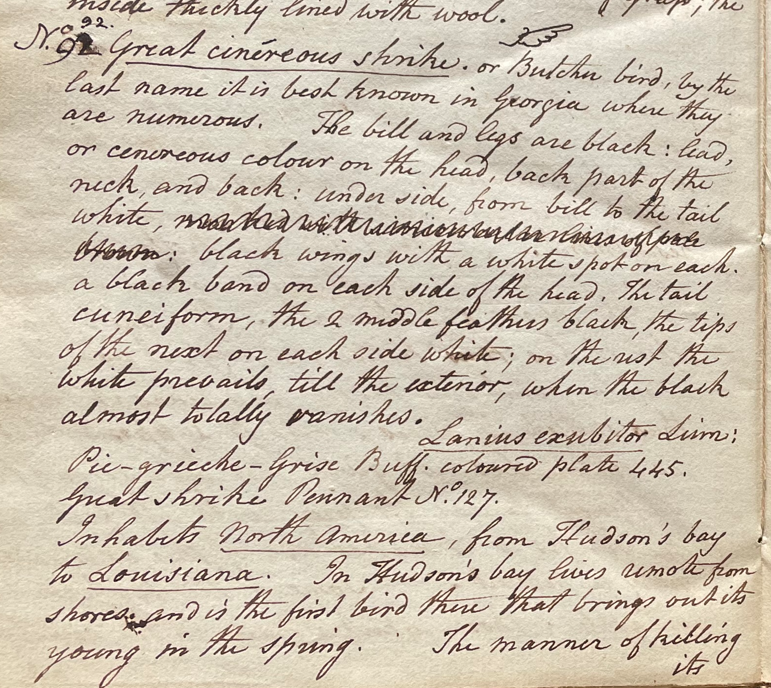 Charles Willson Peale (1741-1827) wrote, in his 14th Lecture (ca. 1799): "No. 92. Great Cinereous Shrike, or Butcher Bird, by the last name it is best known in Georgia where they are numerous. The bill and legs are black; lead, or cinereous colour on the head, back part of the neck, and back; underside, from bill to the tail white; black wings with a white spot on each; a black band on each side of the head. The tail cuneiform, the 2 middle feathers black, the tips of the next on each side white; on the rest the white prevails, till the exterior, when the black almost totally vanishes. Lanius exubitor Linn. Pie-griêche grise Buff. coloured plate 445. Great Shrike Pennant No. 127. (Academy of Natural Sciences of Drexel University Archives, coll. 40)