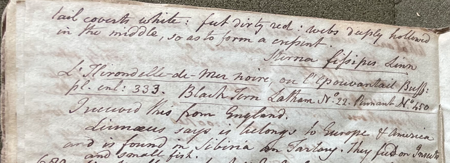 Peale wrote, in "A Walk Through the Philad[elphi]a Museum" (1805–1806): "The Black Tern (S. fissipes) they feed on Insects & small fish: this specimen is from England. Linneus says it belongs to Europe & America & is found in Siberia & Tartary." (Historical Society of Pennsylvania, coll. 0481)