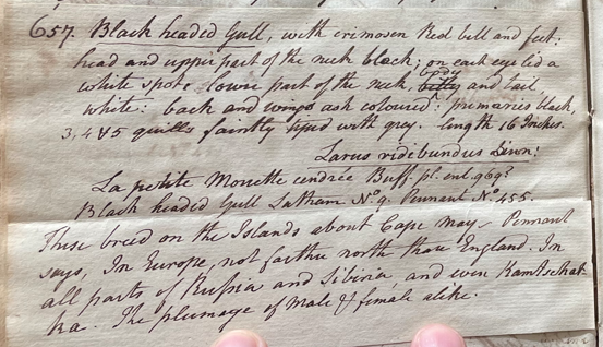 Peale wrote, in his 24th Lecture (ca. 1799): "No. 657. Black headed gull. with crimson Red bill and feet; head and upper part of the neck black; on each eyelid a white spot; lower part of the neck, belly body and tail, white; back and wings ash coloured; primaries black; 3, 4, & 5 quills faintly tipped with grey. Length 16 Inches. Larus ridibundus Linn. La petite Mouette cendrée Buff. pl. enl. 969? Black headed gull Latham No. 9. Pennant No. 455. These breed on the Islands about Cape May. Pennant says, In Europe, not farther north than England. In all parts of Russia and Sibiria, and even Kamtschatka. The plumage of Male & female alike" (Academy of Natural Sciences of Drexel University Archives, coll. 40).