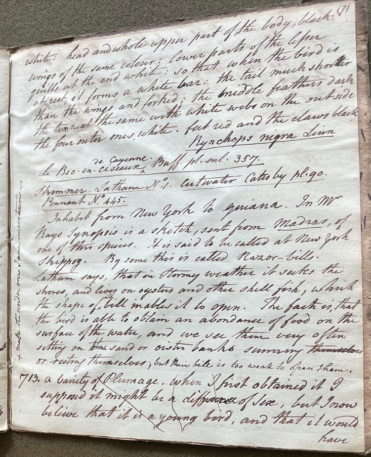 Peale wrote, in "A Walk Through the Philad[elphi]a Museum" (1805–1806): "The last and not the least curious of the order Anseres is the Genus Rynchops, Skimmer or Cut water. This very singular bird has obtained with the french the name Le Bec-en-ciseaux, Scisar-bill, and in fact they do frequently cut their food in two. They are by Pennant and others called Skimmers, because they skim along the waters with the under Mandible catching up small Fishes while this on the wing. / Black Skimmer (R. Nigra) It inhabits from New York to Guiana. By some this is called Razor-bills. Latham says that in stormy weather it seeks the shores, and lives on oisters and other shell fish, which the shape of its bill enables it to open. The fact is, that the bird is able to obtain an abundance of food on the surface of the Water, and we see them very often sitting on the land or oister banks, sunning or resting themselves but their Bill is too weak to open them." (Historical Society of Pennsylvania, coll. 0481)