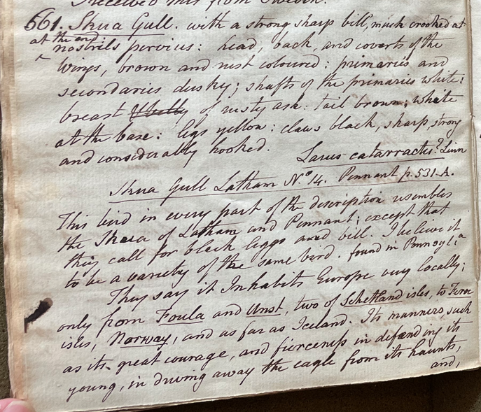 Charles Willson Peale (1741-1827) wrote, in his 24th Lecture (ca. 1799): "No. 661. Skua gull. with a strong sharp bill, much crooked at the end; nostrils pervius; head, back, and coverts of the wings, brown and rust coloured; primaries and secondaries dusky; shafts of the primaries white; breast & belly of rusty ash; tail brown, white at the base; legs yellow; claws black, sharp, strong and considerably hooked. Larus cararractus? Linn. Skua gull Latham No. 14. Pennant p. 531 A. This bird in every part of the description resembles the Skua of Latham and Pennant; except that they call for black legs and bill. I believe it to be a variety of the same bird, found in Pennsyla. They say it Inhabits Europe very locally; only from Foula and Unst, two of Schetland isles, to Ferroe isles, Norway, and as far as Iceland." (Academy of Natural Sciences of Drexel University Archives, coll. 40)