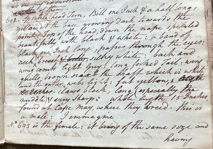 Charles Willson Peale (1741-1827) wrote, in his 24th Lecture (ca. 1799): "No. 692. Speckle head Tern. Bill one Inch & a half long, yellow at the base, growing dark towards the point. Top of the head, down the nape speckled beautifully with black & white; a band of black one Inch long, passes through the eyes; neck & breast & belly, silky white; back and wing coverts light grey; long forked Tail; wing quills brown next the shaft which is white, and the outer wens light; feet yellow; claws black, long (especially the middle) & very sharp; whole length 15 Inches; found at Cape May, where they breed. this is a male. I imagine No. 693 is the female; it being of the same size and having a dark line passing through the eyes; the Head, back, and wing a light grey; neck & breast & belly white; the forks of the tail not quite so long as the preceeding."