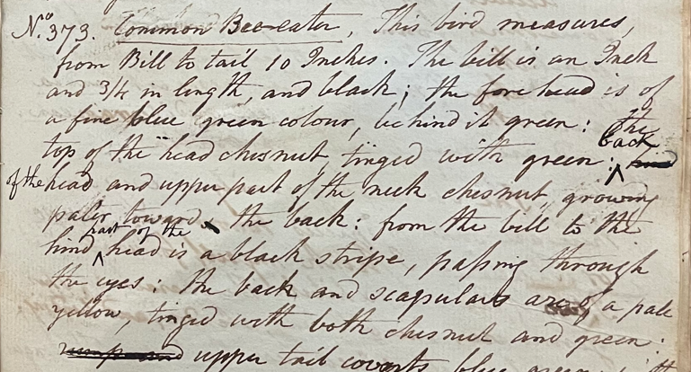 Charles Willson Peale (1741-1827) wrote, in his 19th Lecture (ca. 1799): "373. Common Bee-eater. This bird measures, from Bill to tail, 10 Inches. The bill is an Inch and ¾ in length, and black; the forehead is of a fine blue-green colour, behind it green; the back, top of the head chesnut, tinged with green; the back of the head and upper part of the neck chesnut, growing paler toward the back; from the bill to the hind part of the head is a black stripe, passing through the eyes; the back and scapulars are a pale yellow, tinged with both chesnut and green; upper tail coverts blue green with a yellowish tinge; the throat is yellow; the under parts of the body blue green; wing coverts dull green and Rufous; quills sea green & Rufous, the 2 middle feathers exceed the outer ones by ¾ of an Inch." (Academy of Natural Sciences of Drexel University Archives, coll. 40)