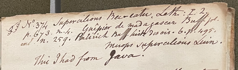 If Peale’s specimen was in fact a close resemblance to Buffon’s “Guêpier de Madagascar," then he must have been misinformed of its origin because the range of this species is restricted to eastern Africa—along the shipping route from Java to Philadelphia. The editor (MRH) has been unable to confirm the source of Peale’s specimens from Java, Indonesia, but there is ample reason to suspect that he received them from Thomas Horsfield (1773-1859), the physician and naturalist. In 1799, Horsfield, who was born and raised in southeast Pennsylvania, and educated at the University of Pennsylvania, took a medical post on the merchant ship China, which sailed to Java. He remained there until 1819, during which time he collected specimens on behalf of Sir Thomas Stamford Bingley Raffles (1781-1826), governor of the Dutch East Indies. In January 1799, before he left for Java, Horsfield visited Peale’s Museum and purchased a ticket “for the year 1799 which intitles [sic] the Purchaser to the use of the Museum every day while the Sun is above the Horizon. Each Ticket [cost] two Dollars.” His signature (“Thos. Horsfield”) appears in a Peale Museum Subscription Book (Historical Society of Pennsylvania, coll. 0481). / https://en.wikipedia.org/wiki/Thomas_Horsfield