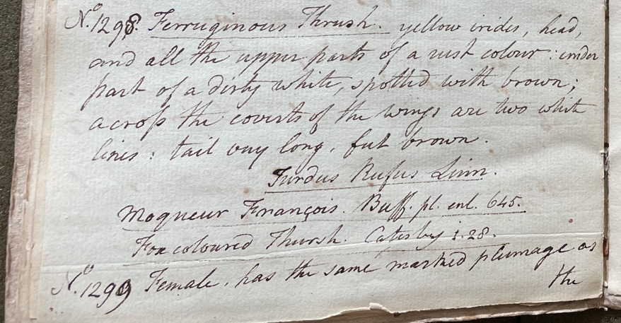 Peale wrote, in his 31st Lecture (ca. 1799): "No. 1298. Ferruginous Thrush. yellow irides, head and all the upper parts of a rust colour; under part of a dirty white, spotted with brownl across the coverts of the wings are two white lines; tail very long, feet brown. Turdus Rufus Linn. Moqueur François. Buff. pl. enl. 645. Fox coloured Thrush. Catesby i: 28. No. 1299. Female, has the same marked plumage as the male. These birds have delightful notes, not a great deal inferiour to the mocking bird [Mimus polyglottos]. They breed in the middle states, and retire farther south to winter." (Academy of Natural Sciences of Drexel University Archives, coll. 40)
