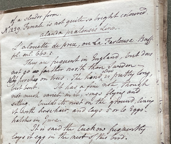 Peale wrote, in "A Walk Through the Philad[elphi]a Museum" (1805–1806): "Tit-lark (A. pratensis) & female. They are frequent in England, but does not go farther north than Sweden. They perch on trees: sings flying & sitting. It is said the Cuckow frequently lays it egg in the nest of this bird." (Historical Society of Pennsylvania, coll. 0481)