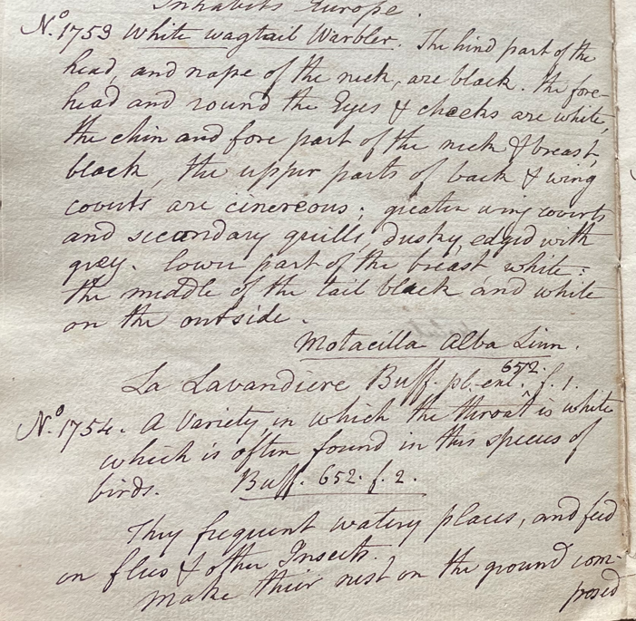 Charles Willson Peale (1741-1827) wrote, in his 35th Lecture (ca. 1799): "No. 1753. White Wagtail Warbler. The hind part of the head, and nape of the neck, are black. The forehead and round the Eyes & cheeks are white; the chin and fore part of the neck & breast, black; the upper parts of [the] back & wing coverts are cinereous; greater wing coverts and secondary quills, dusky, edged with grey; lower part of the breast, white; the middle of the tail, black and white on the outside. Motacilla alba Linn. La Lavandiere Buff. pl. enl. 652. f. 1." (Academy of Natural Sciences of Drexel University Archives, coll. 40)