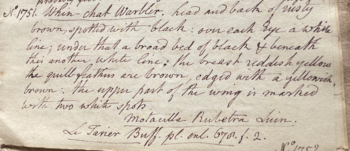 Charles Willson Peale (1741-1827) wrote, in his 35th Lecture (ca. 1799): "No. 1751. Whin-chat Warbler. head and back of rusty brown, spotted with black; over each Eye a white line; under that a broad bed of black & beneath this another white line; the breast reddish yellow; the quill feathers are brown, edged with a yellowish brown; the upper part of the wing is marked with two white spots. Motacilla Rubetra Linn. Le Tarier Buff. pl. enl. 678. f. 2. No. 1752. Female. colours of less brilliancy, and where the cheeks of the male is black, this is brown. Inhabits Europe." (Academy of Natural Sciences of Drexel University Archives, coll. 40)
